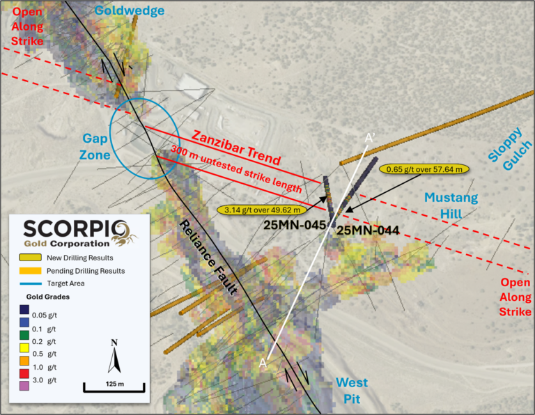 Scorpio Gold Drills 49.62 Metres Grading 3.14 G/T Gold, From 59.95 Metres Extending Mineralization Along Zanzibar Trend At The Manhattan District, Nevada