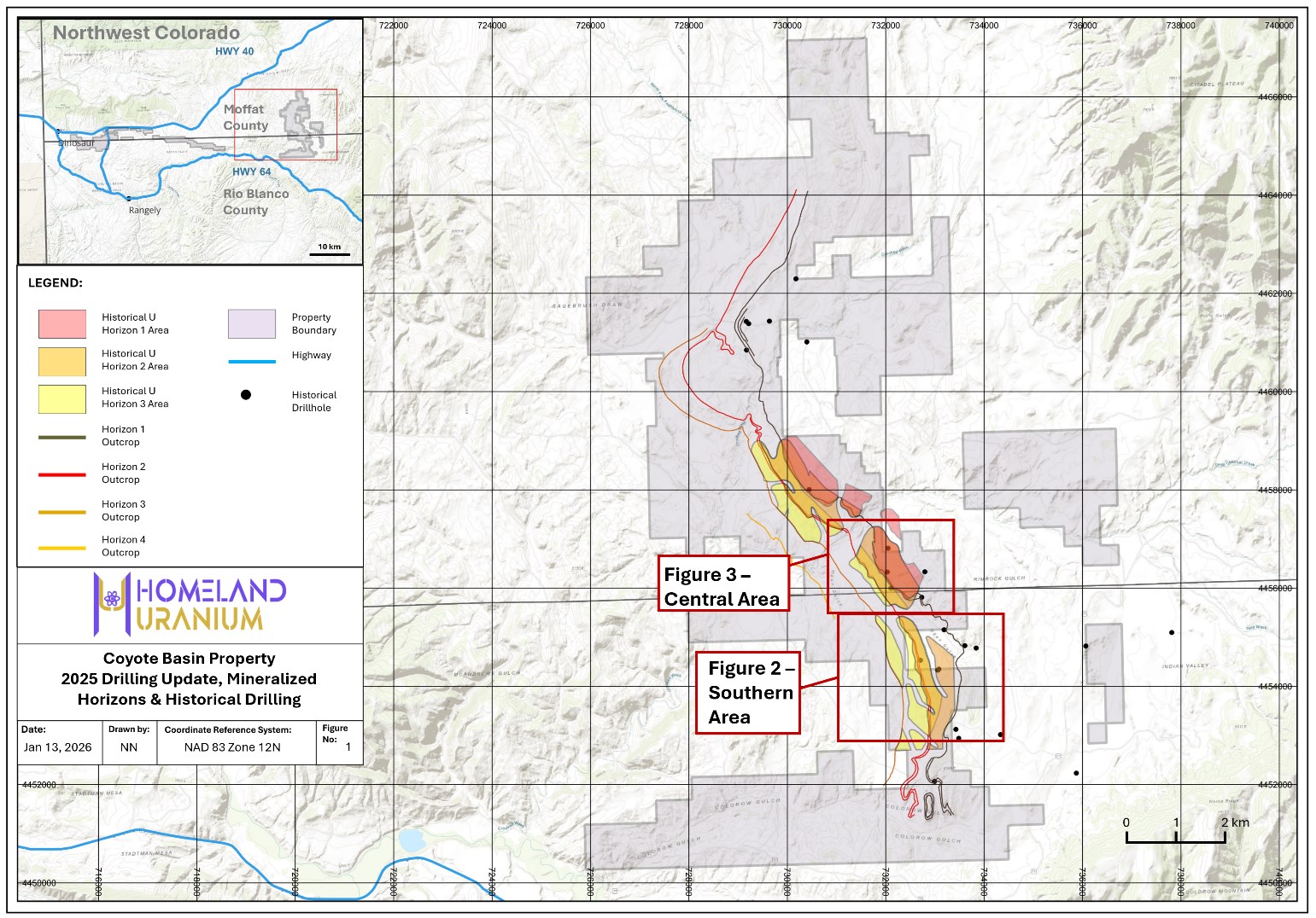 Roger Lemaitre, President and CEO, Homeland Uranium, stated, “With drilling now advancing into the northern portion of the Project, we are focused on evaluating the northern extent of the main historical resource area at Coyote Basin. The presence of elevated radioactivity observed in this area is consistent with what was encountered in historical drilling and provides additional confidence in the continuity of the mineralized system. As the program progresses, our objective remains to systematically expand the footprint of this anomalous horizon while advancing geochemical analysis to better characterize the uranium mineralization.”