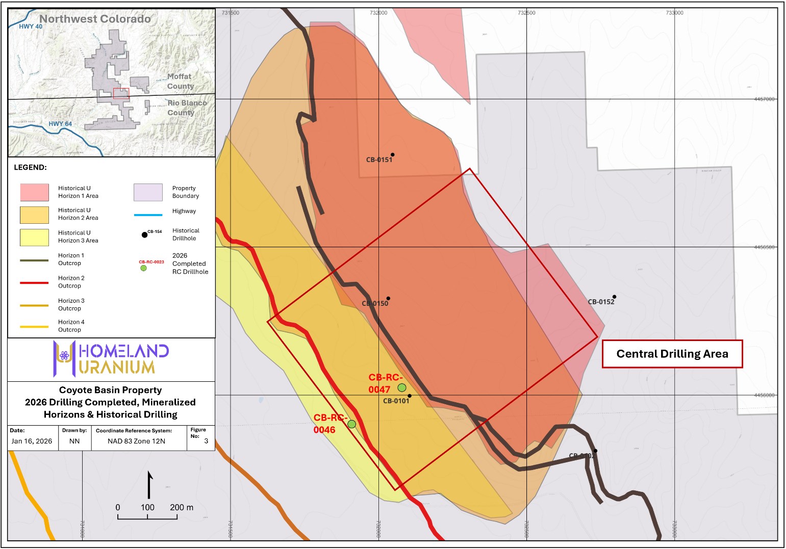 Drilling has now shifted to the central portion of the Project with drillholes CB-RC-0046 and CB-RC-0047 (Figure 3), which comprise part of a planned northeast-southwest oriented drill fence designed to evaluate the area of the historical WMR resource and to follow up on reported mineralization, including 0.826% U₃O₈ intersected in historical drillhole CB-101 (private internal report, Western Mining, Executive Summary, Coyote Basin Uranium District, Rio Blanco and Moffat Counties, State of Colorado, January, 1980). Initial downhole probe results from this area indicate a continuous (between drillholes) near-surface interval of elevated radioactivity extending from surface to approximately 50 metres (164 feet) depth and associated with the same rock types identified in the 2025 drilling program.