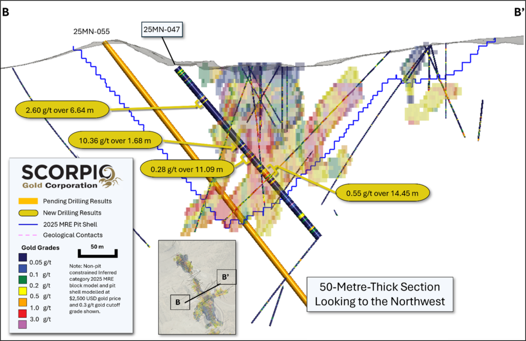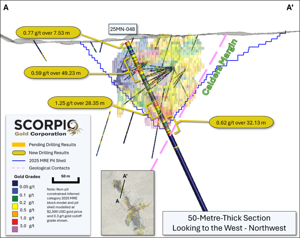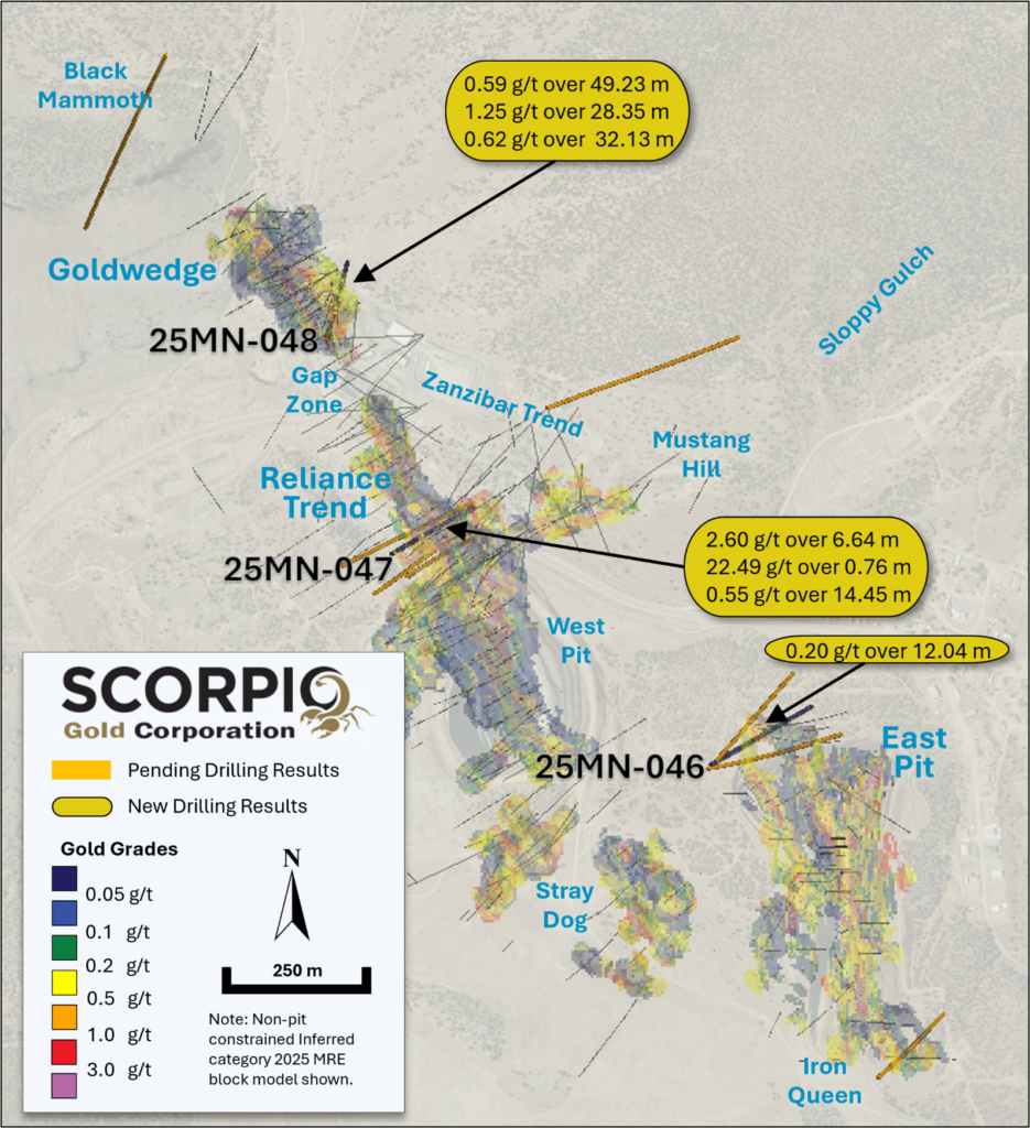 Drill hole 26MN-048 was drilled at Goldwedge to test the faulted contact zone between caldera volcanics and Zanzibar Formation sedimentary units that host the June 2025 Inferred Mineral Resource Estimate. Drill hole 26MN-047 was drilled along the Reliance Trend, a 50 m step-out to the northwest of hole 25MN-042, see news release dated February 11, 2026. Drill hole 26MN-046 was drilled to the north of the historic East Pit as a 50 m vertical step-out from drill hole 25MN-043. This drill hole was testing a northerly extension of a mineralized west trending fault splay and confirmed the mineralization exists to the east of this drill hole. All three holes tested beyond the Inferred Resource Constraining Pit (“IRCP”), see Figure 1. For further details see “Mineral Resource Estimate and NI 43-101 Technical Report, Manhattan Property, Nye County, Nevada” with an effective date of June 4, 2025, on Scorpio Gold’s website at https://wp-scorpiogold-2025.s3.ca-central-1.amazonaws.com/media/2025/10/Scorpio-Gold-Manhattan-Mineral-Resource-Estimate-43-101-FINAL-2025-10-23.pdf.