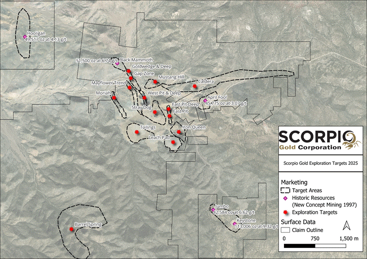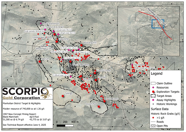 November 11th, 2025 – Vancouver, British Columbia – Scorpio Gold Corporation (TSX-V: SGN, OTCQB: SRCRF, FSE: RY9) (“Scorpio Gold”, “Scorpio” or the “Company”) is pleased to provide an update on 19 high-potential exploration targets at the 100%-owned Manhattan District (“Manhattan”) located in Nevada, USA.