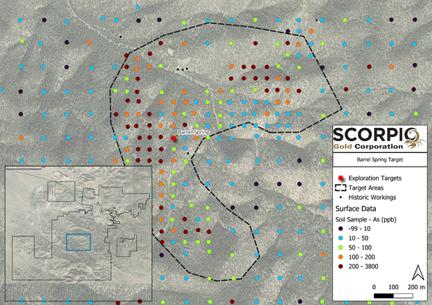 Barrel Spring This target is along a larger fold hinge, like the setting at Black Mammoth, and near the Roberts Mountain Thrust Fault. Geology is complex and comprised of the Ordovician Zanzibar and Cambrian Gold Hill Formations, as well as an overthrust of Lower Cambrian Harkness Formation and later Cretaceous intrusive units. This area hosts the first patented claim in the entire Manhattan District, just to the north of Scorpio’s target. There is a large ~3 km long soil anomaly with anomalous gold, arsenic, and antimony in the area. See Figure A3 (Appendix A). Data compilation and development of next phase work programs. Permitting in progress with the USFS and BLM.