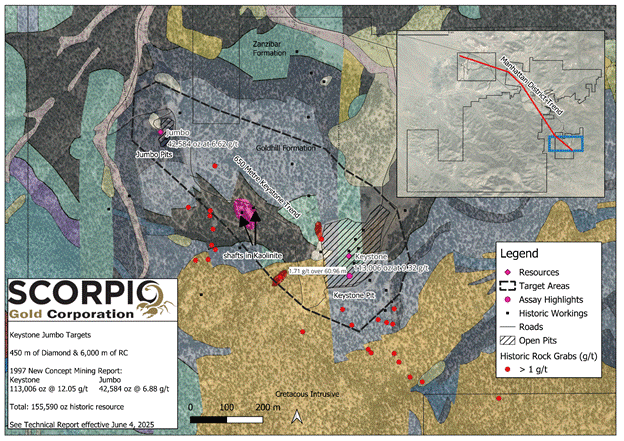 Keystone Jumbo The historic high-grade Keystone and Jumbo pits lie ~5 km to the SE of the main MRE area. Geology of the area is comprised of fine-grained clastic sediments, breccias, a felsic stock, and sills and dikes with extensive brecciation. Mineralization is classic low sulphidation epithermal type, with extensive drusy quartz, carbonate textures in veins, and breccia fill with pyrite and its oxidation products and associated clays. Mineralization appears to be focused along a north trending fault system. Free gold is hosted mainly in quartz along the walls of kaolinized faults. The area notes boundaries between Roberts Mountain Thrust/Cretaceous Intrusive/Manhattan Anticline. Keystone and Jumbo were previously mined open pits (1970s). Previous Scorpio management completed a preliminary phase of drilling at the target in 2019 but did not follow up with the indicated follow-up phase of drilling (see news release dated December 6, 2019). Estimated 156k oz Au (7.64 g/t) historic resource (New Concept, 1997 – see Technical Report effective June 4, 2025). See Figure A2 (Appendix A). Data compilation work, develop geological model and target Historic Resource area and extensions. Existing Plan of Operations with USFS needs updated bonding prior to commencing drilling activities.