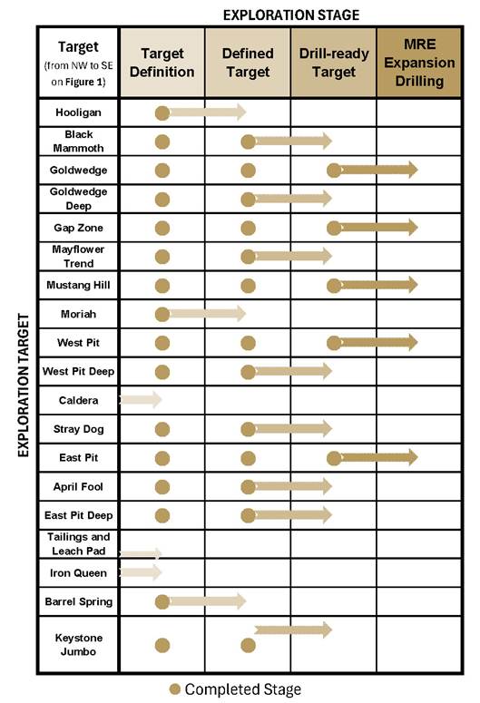 Scorpio has made large advances towards being able to develop a genetic model for gold mineralization that can be used predictively to target both extensions of existing resources and known mineralization, and to generate new targets. To date, 19 exciting targets have been identified and categorised into four exploration stages, ranging from Target Definition to Mineral Resource Estimate (“MRE”) Drilling. The first stage, “Target Definition”, is defined as a target that has existing data, but needs compilation to define the target and work program needed to advance to the next stage. The second stage, “Defined Target”, is a target that is well defined in two or three dimensions and requires additional data collection to advance to a drilling stage. The third stage, “Drill-ready Target”, requires minimal additional work prior to beginning drilling the target. The final stage, “MRE Drilling”, is a target with existing drilling that can be included in a MRE or can be drilled to expand its current MRE.  These targets are summarised in Table 1 and shown on Figure 1.